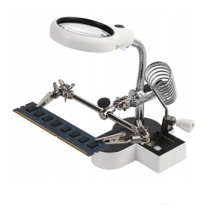 A "harmadik kéz" állítható fém csipeszei biztos fogást nyújtanak, miközben mindkét kezünk szabadon marad a munkához. A flexibilis nagyítós kar könnyedén állítható a kívánt pozícióba. A beépített spirál alakú pákatartó pedig gondoskodik az eszköz biztonságos elhelyezéséről munka közben.